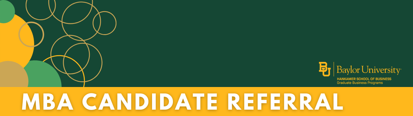To refer a prospective MBA student, complete this brief form. Your submission is confidential and used only by our enrollment team. We will connect with the candidate and invite them to engage further and explore Baylor’s MBA programs. By submitting, you confirm the candidate knows you are referring them; we will notify them of your recommendation. This form is for graduate referrals only.
